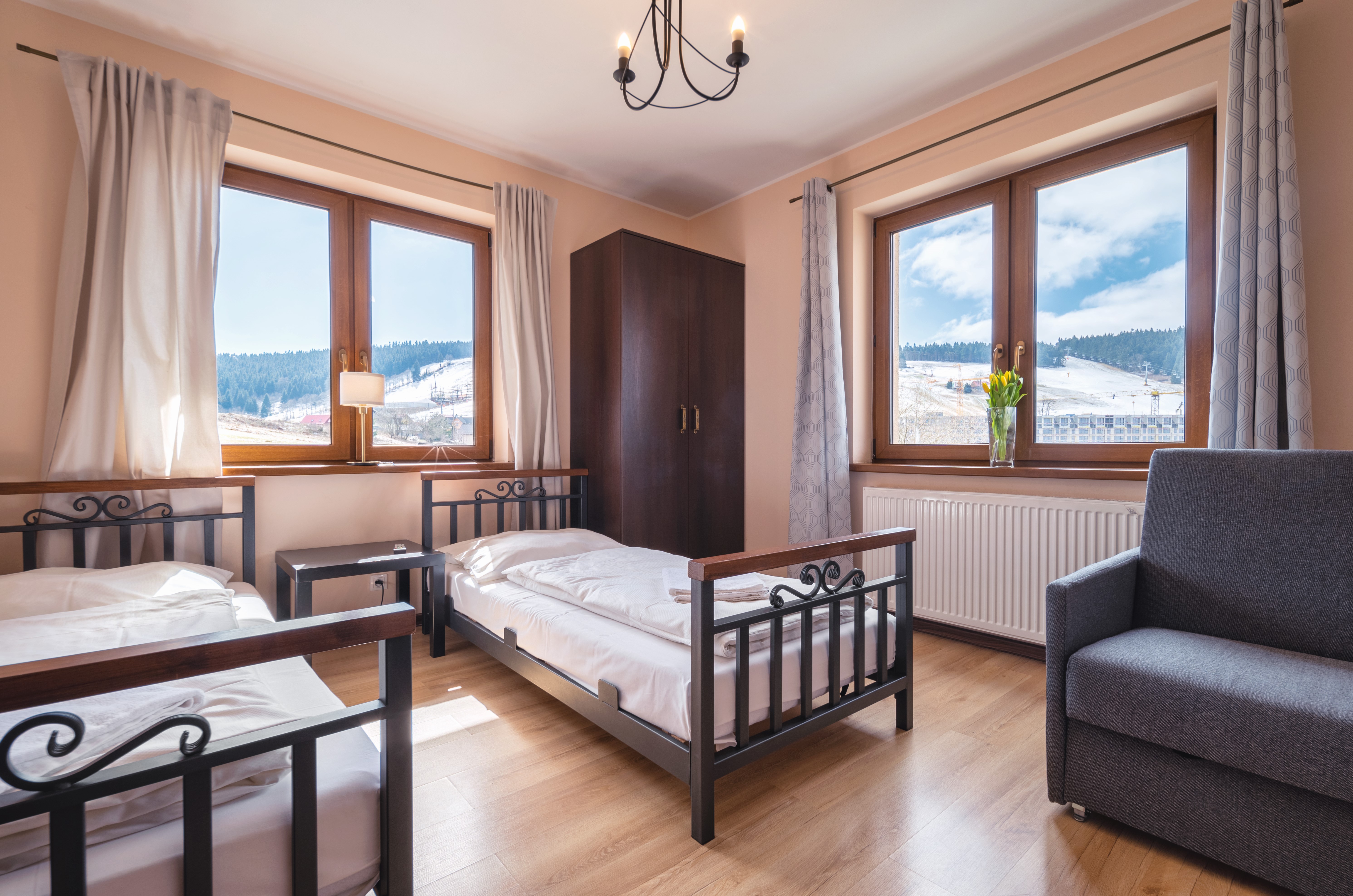 Dom idealny dla 4 - 5 rodzin z dziećmi - 14 łóżek noclegowych o wym. 90x200, + 3 sofy rozkładane, położony w ścisłym centrum Zieleńca. Do pomarańczowej kanapy 6 osobowej mamy mniej niż 300m, a do górnej stacji wyciągu nr 6 zaledwie 100m.